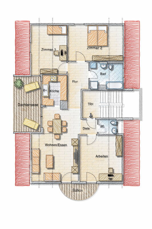 Die großzügige Wohnung erstreckt sich über das komplette Dachgeschoss. Die Wohnfläche von ca. 96,10 m² verteilt sich auf einen hellen Wohn- /Essbereich, eine offene Küche, drei Zimmer und Gäste-WC.