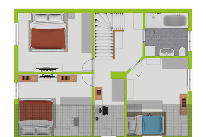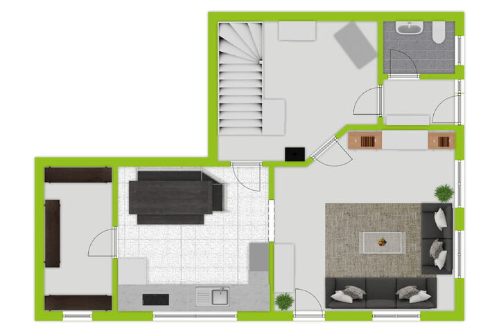 Im Jahre 2003 wurde der hintere und der süd-westliche Teil des Gebäudes abgerissen und neu aufgebaut. Im hinteren Teil befindet sich eine Wohnung mit rund 135m² Wohnfläche auf zwei Etagen. Diese ist derzeit vermietet (1.200€ mtl. Kaltmiete zzgl. 60€ für eine Garage). Die Wohneinheit umfasst im Erdgeschoss Wohnzimmer, Wohnküche, einen an die Küche angrenzenden Abstellraum und Gäste-WC. Im Obergeschoss sind Bad (mit Wanne, Dusche und WC), drei Schlafzimmer und ein Arbeitsplatz untergebracht. Von dieser Wohnung gelangt man zum einen in den Kellerraum (Haus ist nur teilweise unterkellert) sowie den sehr großen und durch bereits vorhandene Fenster an den Giebelseiten lichtdurchfluteten Bühnenraum; bei Bedarf bietet sich hier noch Ausbaupotential. Die vermietete Wohneinheit wird beheizt über die 2003 installierte Gas-Zentralheizung sowie den ebenfalls 2003 eingebauten schönen Kachelofen, der zusätzliche angenehme Wärme liefert.